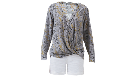 Reminiscent of a blouson-style top, this surplice-front blouse features four stacked pleats near the waist edge, which are pressed and left unsewn on each side of the crossover front, bust…